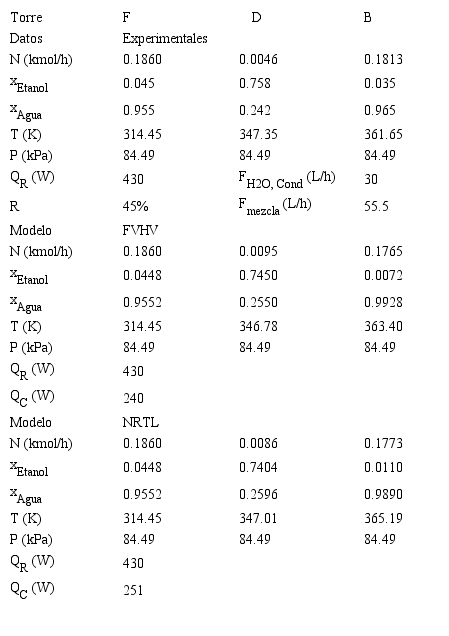 Adicionalmente, se presenta el flujo de calor del rehervidor y del condensador del proceso de destilación obtenido por los modelos FVHV, NRTL y experimentalmente. En las condiciones de operación experimental de la TDC en estado estacionario se puede observar que la fracción molar del etanol de alimentación fue de 0.045 y en la corriente del destilado (D) fue de 0.758. El valor de R es la relación de retorno de destilado expresado por el controlador del equipo en porcentaje (%) y se debe entender como la relación entre el tiempo de apertura de la válvula de conmutación 10 y la suma de tiempos de apertura de las válvulas de conmutación 7 y 10 (C en Fig. 1).