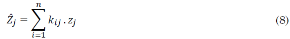 Donde j es el valor estimado para el punto, j.n es el número de puntos utilizados para la interpolación, zj es el valor en el punto i - ésimo, kij es el peso asociado al dato i en el cálculo del nodo j. Los pesos k varían entre 0 y 1 según el dato y la suma total de los pesos es la unidad [25].