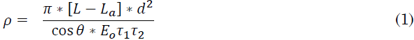Donde ρ es la reflectividad, E0 es la irradiancia exoatmosférica, τ1 es el coeficiente de transmisión atmosférica sol-tierra para cada una de las bandas B1τ1 = 0.70, B2τ1 = 0.78, B3τ1 = 0.85, B4τ1 = 0.91, B5τ1 = 0.95 y B7τ1 = 0.97, τ2 = 1 es el coeficiente de transmisión atmosférica tierra-sensor, L es la radiancia del pixel a corregir, La es el valor mínimo de niveles digitales por cada banda, θ es el ángulo cenital solar y d = 1.49598 * 108 Km es la distancia tierra-sol [5].