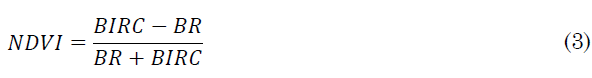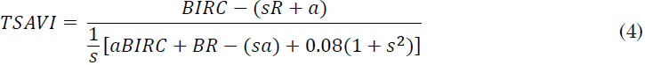 En (4) el numerador aparece con la diferencia entre el valor de la banda BIRC y el valor que tendría esta banda si toda la luz en el rojo procediese del suelo, y el denominador se define de tal forma que se corrija los efectos debido a la visión del suelo entre la vegetación, s y a son la pendiente y el intercepto con el suelo [20].