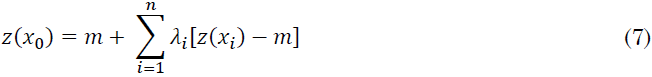 Donde z ( x0 ) es el valor estimado de la variable en la posición x0, λi son los pesos calculados por medio de la matriz de covarianza, m es la media del valor de la variable, Z ( xi ) son las mediciones de las variables de interés en los puntos i =1 , 2,…, n [23]