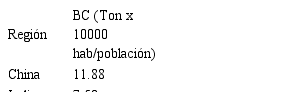 En la Tabla 8 se muestra la comparación de emisiones de BC por cada 10000 habitantes para el Valle de Aburrá y los países de China e India, en donde se muestra que China tiene la mayor emisión de BC, la cual es aproximadamente cinco veces la emisión del Valle de Aburrá por cada 10000 habitantes.