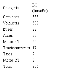 En la Tabla 2 se presentan las emisiones anuales de BC discriminadas por categoría vehicular. Se observa que la categoría camiones seguido de las volquetas son los mayores emisores aportando el 43 % y 37 %, respectivamente, del total de las emisiones asociadas a fuentes móviles.