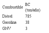 El combustible diésel es el principal responsable por las emisiones de BC seguido de la gasolina, con el 96 % y 4 %, respectivamente.