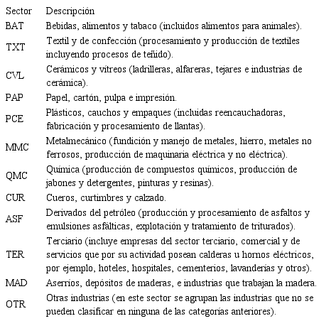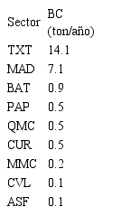 A partir de los resultados de emisiones obtenidos para las diferentes actividades industriales, se concluye que el sector Textil es el que más aporta en emisión de este contaminante, seguido de la industria maderera con un 59 % y 30 %, respectivamente, del total de las emisiones de BC asociadas a fuentes fijas. Los demás sectores productivos aportan muy poco a la emisión de este contaminante por lo que no se incluyeron en la Tabla 5.
