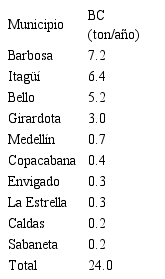 En la Tabla 6 se muestran las emisiones anuales por municipio, en donde se observa que el municipio de Barbosa realiza los mayores aportes de BC seguido del municipio de Itagüí con un 32 % y 27 %, respectivamente, del total de las emisiones en el Valle de Aburrá. Los demás municipios del Valle de Aburrá aportan muy poco a la emisión de este contaminante.
