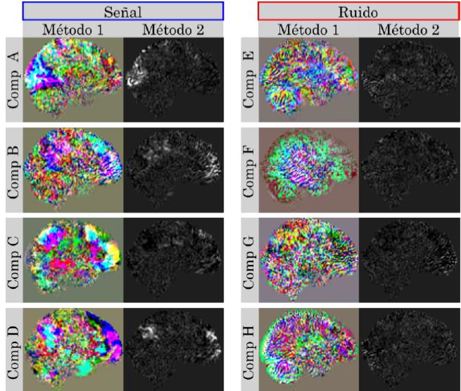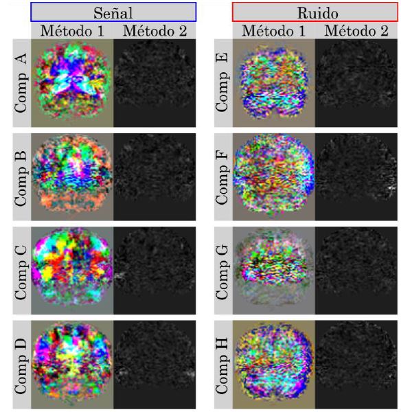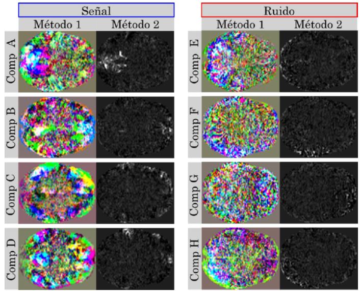 En la Figura 6 se muestran ocho componentes independientes, cuatro asociadas a actividad neuronal (señal) y cuatro a ruido. Los dos métodos arrojaron imágenes similares con características que se presentan en las mismas regiones anatómicas. Es decir, donde se espera que la componente esté ubicada. Por otro lado, el método 2 es el mapa espacial real de la componente de un único corte (corte medio). Por lo tanto, gracias a la concordancia espacial de las dos imágenes, se puede inferir que el primer método está conservando parte de las características espaciales. Por ejemplo, la componente A en el método 2 indica que esta se ubica en la parte posterior del cerebro, región que se resalta en el primer método. De hecho, los colores de esta región presentan mayor homogeneidad en contraste con la irregularidad de las otras regiones. Por otra parte, las imágenes relacionadas con el ruido no presentan regiones homogéneas tan definidas, lo cual supone una diferencia entre estos dos tipos de componentes independientes.