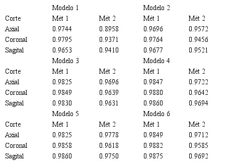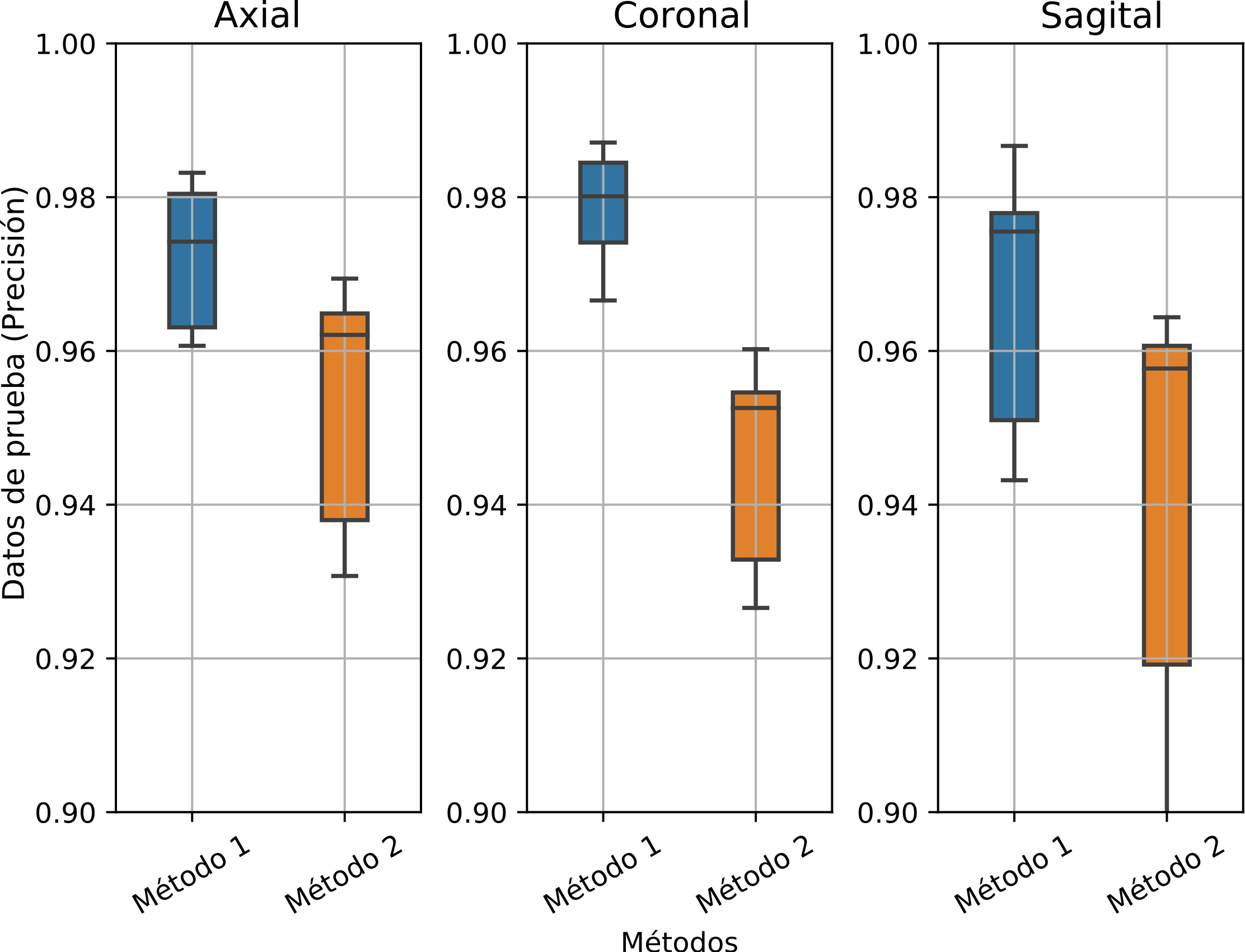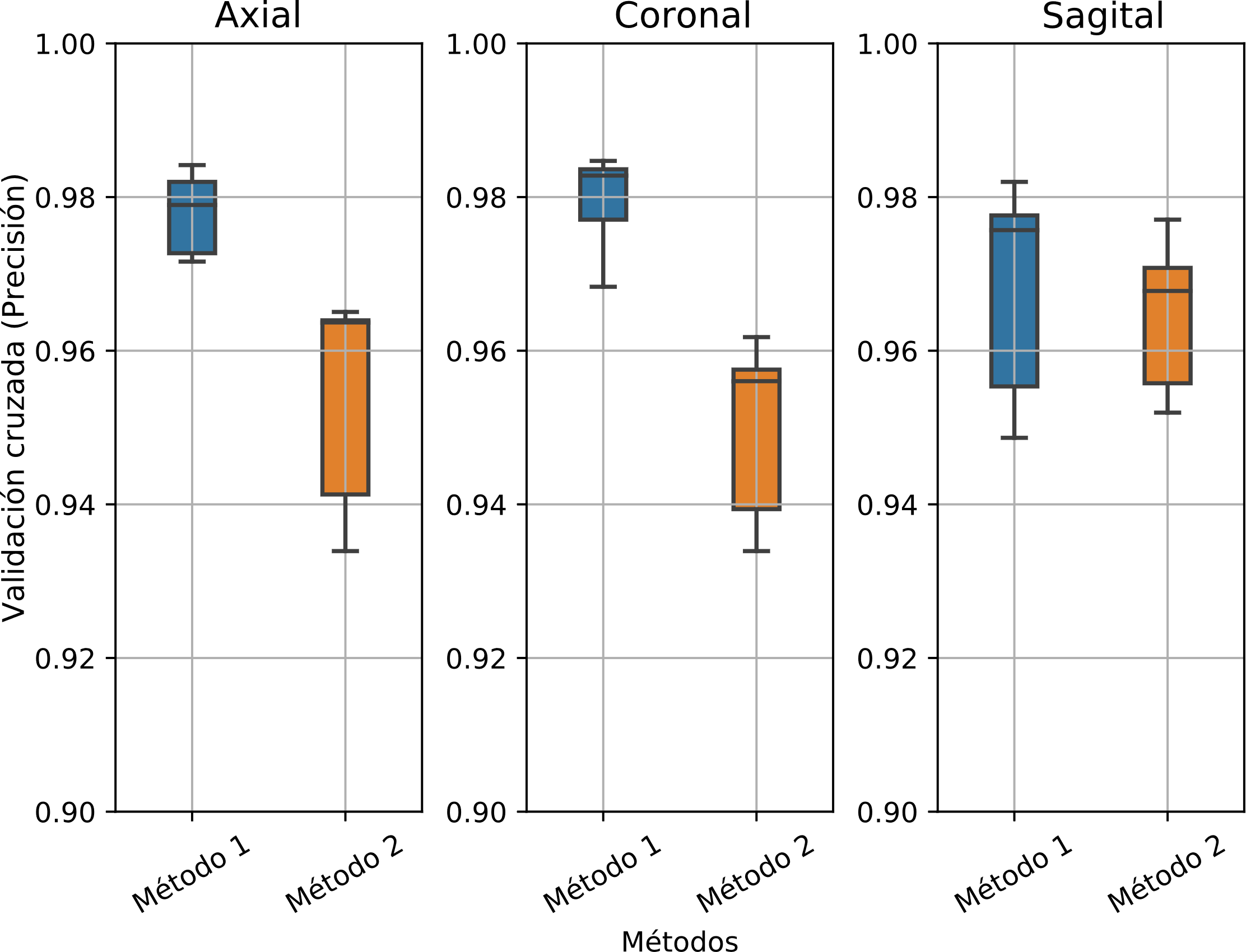 La Figura 9 muestra la distribución para la validación cruzada. En las tres gráficas se ilustra el comportamiento de las imágenes axial, coronal y sagital, respectivamente. En ellas se ve claramente que el método 1 tuvo mejores resultados para las imágenes axial y coronal. Por el contrario, la distribución en la imagen sagital tuvo un comportamiento similar entre los dos métodos.