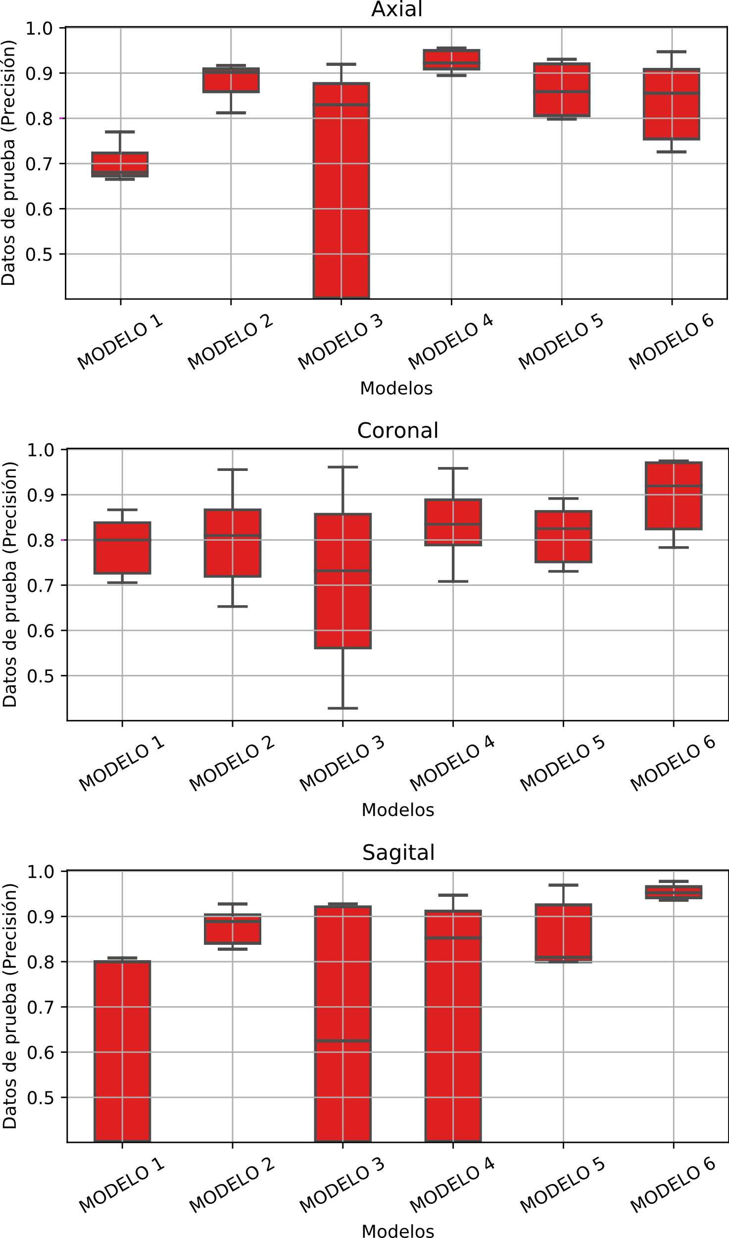 La Figura 10 muestra la distribución de los datos de prueba en función de los modelos. En las tres gráficas se ilustra el comportamiento de las imágenes axial, coronal y sagital respectivamente. En estas se ve que el modelo 3 tuvo la peor distribución en todos los casos.
