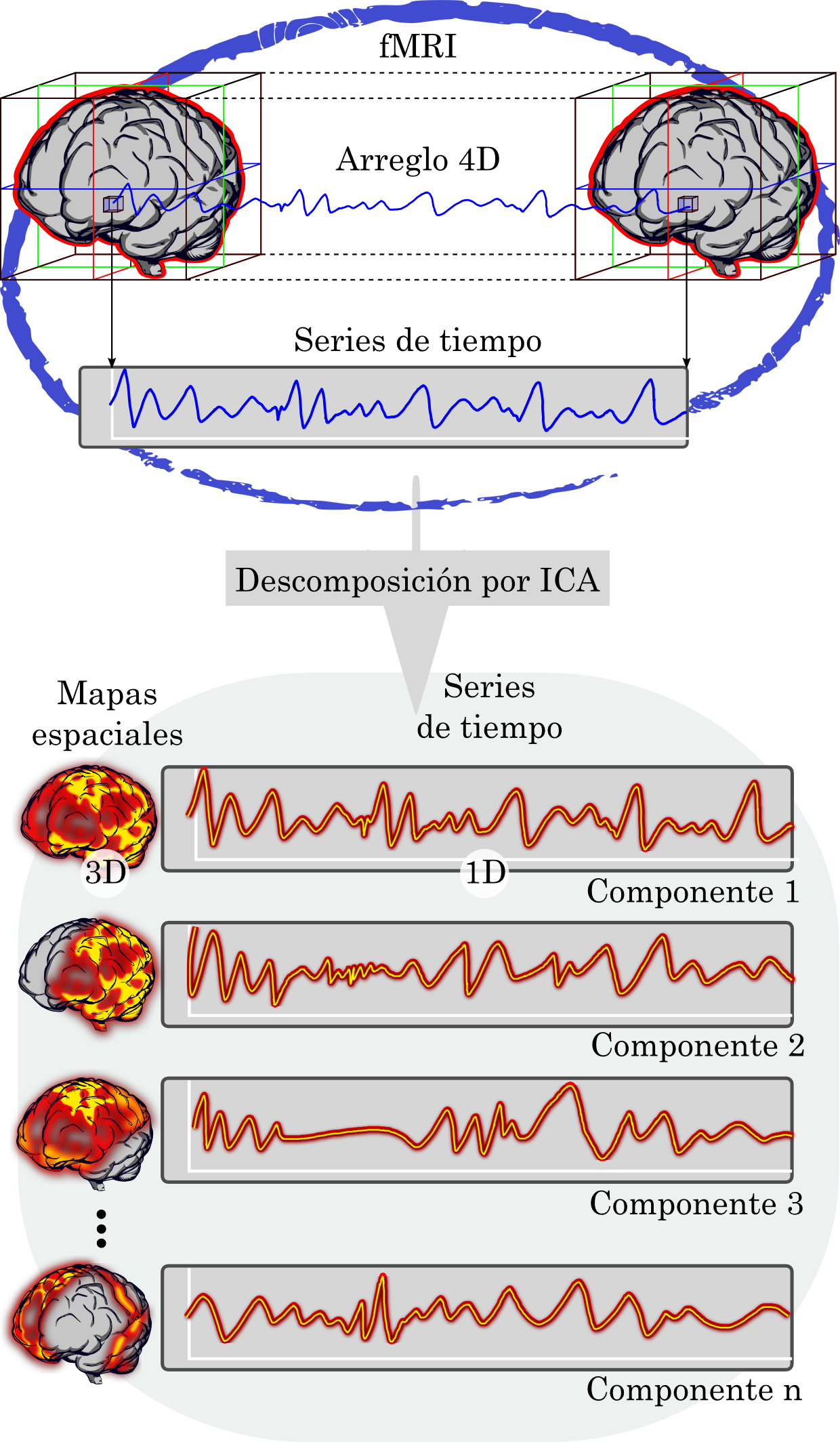 Esta señal es una medida indirecta de la actividad neuronal, sin embargo, la fMRI logra captar cambios o ruido de otros procesos que pueden ser de origen fisiológico, instrumental, aleatorio y de movimiento [12]. Por lo tanto, surge la necesidad de limpiar la señal BOLD de todos los elementos o artefactos que ocluyen la señal de interés con el fin de encontrar una resonancia magnética definitiva [13]. En este sentido se han propuesto múltiples métodos, como por ejemplo los de referencia externa, el análisis estadístico sobre la actividad neuronal espontánea [14]–[18] y aplicaciones en aprendizaje de máquina [19]. Adicionalmente, en este último han surgido alternativas prometedoras como el análisis de componentes independientes (ICA). La técnica ha demostrado ser una herramienta poderosa para la separación ciega de fuente, descomponiendo la fMRI en componentes temporales con un mapa espacial asociado [20] (ver Figura 1).