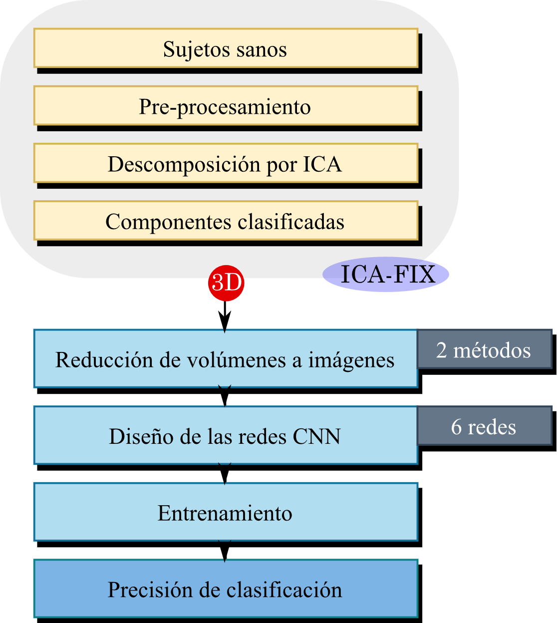 En este sentido, nosotros propusimos una nueva estrategia de dos etapas para la clasificación de componentes independientes. En la primera etapa, se redujeron los volúmenes de las componentes independientes a imágenes a través de dos métodos diferentes. En la segunda, las reducciones se usaron sobre seis redes neuronales convolucionales a fin de entrenar los mejores modelos de clasificación.