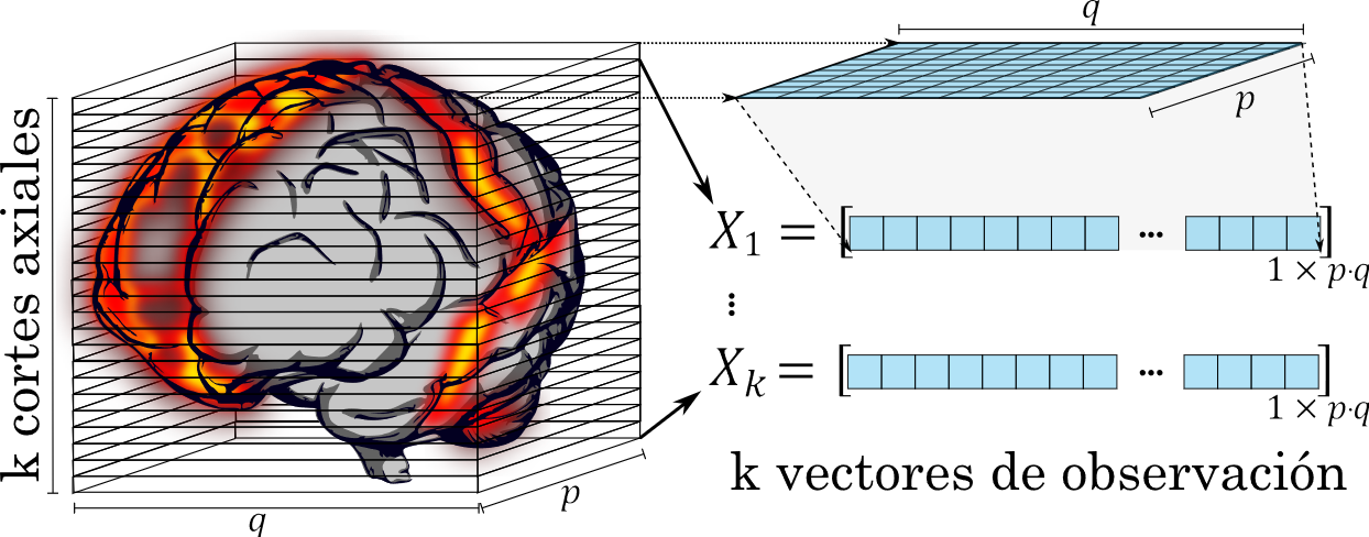 Posteriormente, cada matriz se almacenó en un vector Xicorrespondiente al i-ésimo corte con dimensiones equivalentes a las dimensiones p∙q (ver Figura 3).