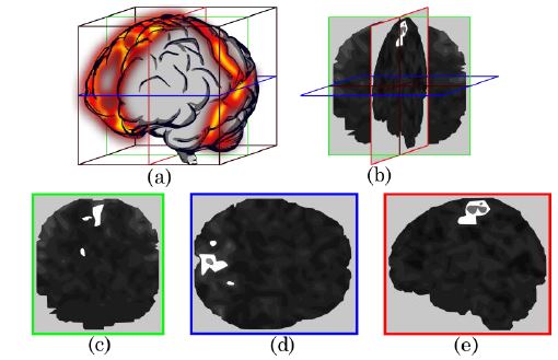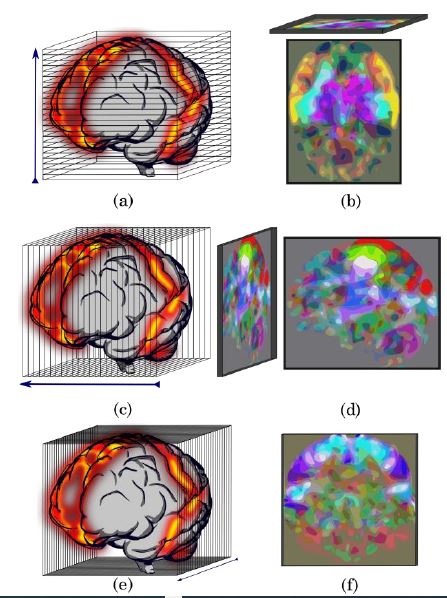 En (1) se puede ver que las componentes principales tienen las mismas dimensiones de los vectores Xi. Por lo tanto, a cada componente se les puede aplicar el proceso inverso ilustrado en la Figura 3. El proceso genera matrices de tamaño p×q y las tres primeras componentes principales se almacenan en los canales RGB para generar la imagen estándar de 8 bits (ver Figura 4 (b). Las imágenes de los cortes coronal y sagital se generan de la misma manera, sin embargo, las matrices de observaciones se toman como los cortes consecutivos a lo largo de sus respectivos ejes como se ilustra en la Figura 4 (c) y (e), obteniéndose imágenes similares a las ilustradas en la Figura 4 (d) y (f).