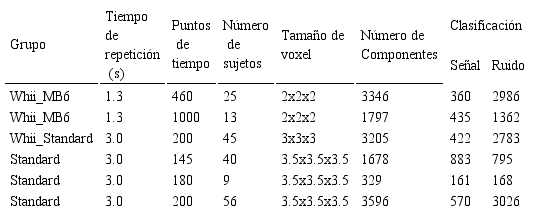 Se usó la base de datos pública del proyecto ICA-FIX. El conjunto se basa en 6 grupos de imágenes rs-fMRI obtenidas de los proyectos Human Connectome Project [38] y Whitehall II imaging study [39].Los datos cuentan con la descomposición ICA realizada con el software FSL-5.0 [40], [41]. Asimismo, esta se implementó con la herramienta llamada descomposición optimizada lineal exploratoria multivariada en componentes independientes (MELODIC por su siglas en inglés) [23], [24], [42]. Se usaron en total 13951 componentes independientes, de las cuales 2831 están etiquetadas como señal (actividad neuronal) y 11120 como ruido.