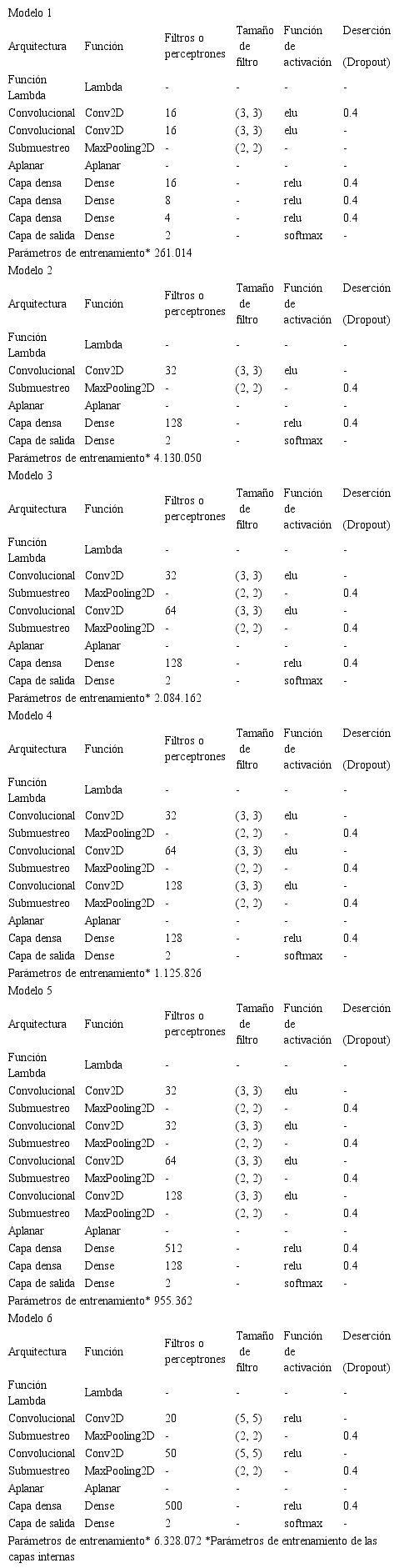 Haciendo uso de una función lambda, las imágenes se normalizan a la entrada de las redes. Posteriormente, se agregaron las capas convolucionales en combinación con las de submuestreo. Las salidas de las convolucionales se aplanaron, se pasaron a la estructura de capas densa y se redujeron gradualmente hasta la capa de dos salidas (clasificador binario). Las redes difieren en el número de capas convolucionales, la cantidad de filtros, el número de capas densas y el número de perceptrones. En la Tabla 2 se muestra detalladamente las estructuras de los modelos. Cabe señalar que el último modelo tiene la estructura de la red LeNet-5 [45], la cual sigue el mismo comportamiento de las cinco primeras.