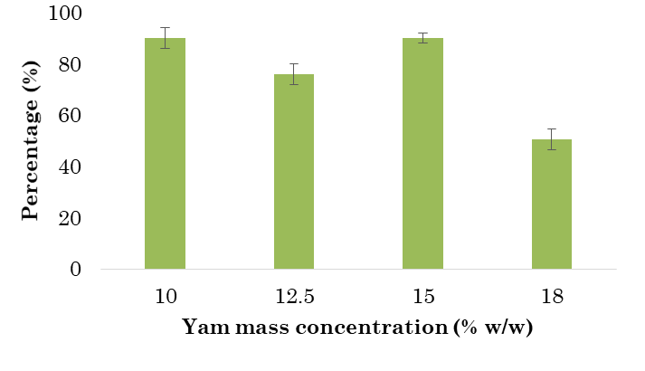 Dioscorea rotundata peels were cut and removed, and the peeled yam was mashed. Subsequently, each sample was prepared using different yam concentrations (10 %, 12.5 %, 15 %, and 18 % w/w) in 250 mL of distilled water.