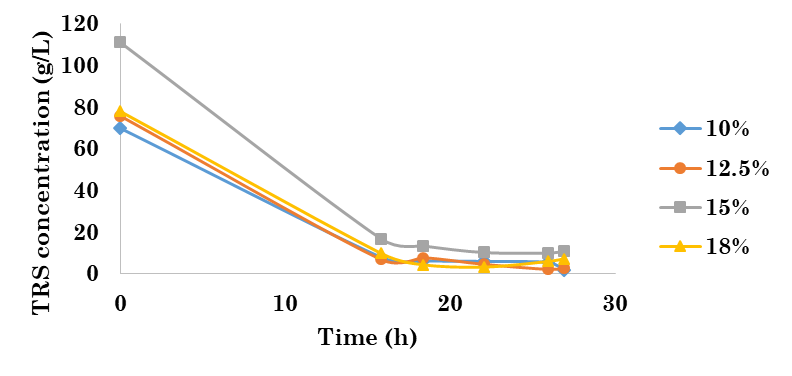TRS concentration was measured throughout the SSF process. As shown in the TRS consumption plot (Figure 2), a stabilization is observed from hour 22, with TRS concentrations close to zero for each system, as stated in [23], [22], and [24]. Hence, TRS consumption was 50 % faster than the results obtained in [18], where the TRS concentration was close to zero after 50 h of fermentation, applying SHF from Dioscorea rotundata. Furthermore, TRS consumption was 30 % faster than that reported in [8], in which authors achieved a TRS concentration close to zero after 27 h, applying SSF from cassava flour. In the first 24 h, this behavior suggests that rapid TRS reduction is mainly caused by cell growth, as proposed in [22].