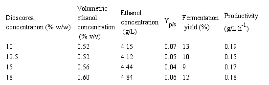 The highest ethanol productivity and YP/S were observed in the system with a yam concentration of 10 % w/w (Table 1). By comparison, in the systems with a yam concentration from 12.5 % to 18 % w/w, the samples’ productivity showed a positive linear trend. However, if these results are compared to those obtained with other tubers, YP/S was 84.5% lower than the results reported in [8] from cassava flour fermentation via SSF. Moreover, the fermentation yield was lower than that obtained in [23] (82, 79, and close to 95 %) from cassava, potato, and sweet potato starch.