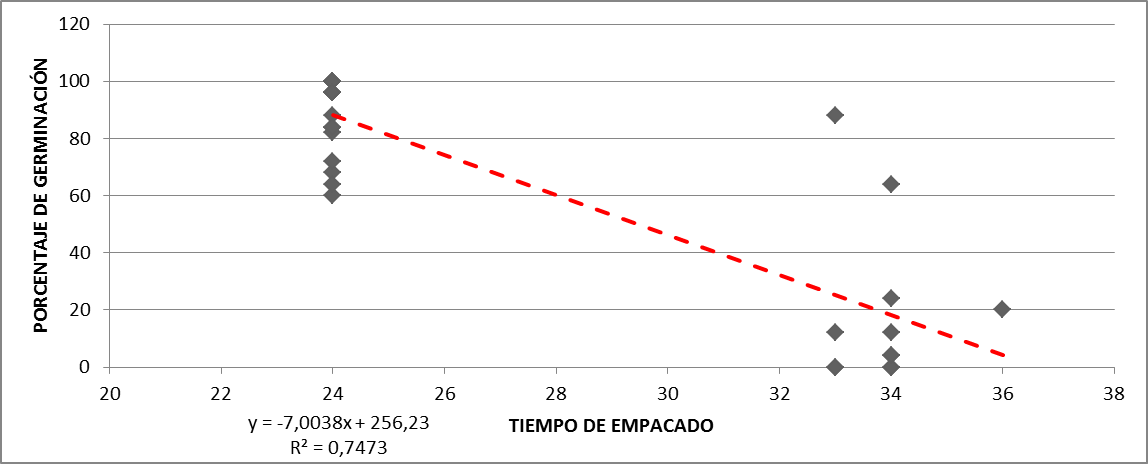 Dado que el tiempo de empacado pudo influir en la calidad de las semillas y su desempeño fisiológico, lo cual se reflejó en una menor viabilidad y porcentaje de germinación, se realizó una análisis de regresión entre el tiempo de empacado y el porcentaje de germinación, encontrando una relación negativa entre el tiempo de almacenamiento y la germinación, lo que demuestra que a mayor tiempo de empacado las semillas pierden su viabilidad [24] debido al ataque de patógenos y a las condiciones inadecuadas de almacenamiento (Figura 2).