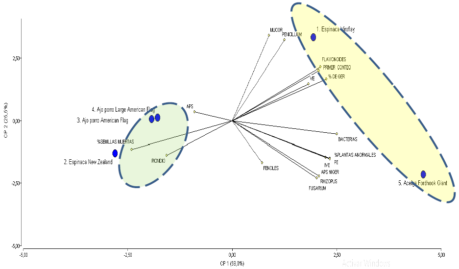 En la Figura 3 se observa que el 59,0 % de la variación es explicado por el componente 1. En el biplot se evidencian dos grupos, unos asociados a un mejor desempeño fisiológico (espinaca Viroflay y acelga Foorhood Giant), los cuales poseen altos valores de germinación total y de porcentajes de flavonoides, mientras que el otro grupo (espinaca New Zealand, ajoporro American Flag y ajoporro Large American Flag) presenta un pobre desempeño fisiológico asociado al porcentaje de semillas muertas y frecuencia de picnidios que indica la presencia de hongos como Macrophomina phaseolin [2].