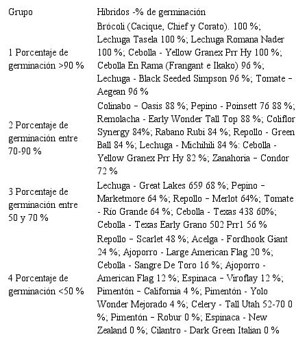 Los resultados de la evaluación de 36 híbridos de hortalizas comercializados en la región Centooccidental de Venezuela se muestran en la Figura 1. Allí se puede observar que el 57,14 % presentaron una germinación optima (>90 %); 28,67 %, germinación moderada (50-90 %); y 14,29 % fue deficiente (<50 %). Particular interés debe prestarse a los híbridos de espinacas Viroflay y New Zealand, ajoporros American Flag y Large American Flag y acelga Fordhook Giant, las cuales presentaron una germinación debido a la perdida de la viabilidad de las semillas por el tiempo de almacenamiento y proliferación de patógenos por posibles condiciones inadecuadas de almacenamiento [23].