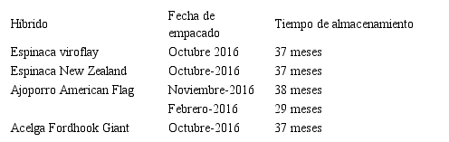 Se utilizaron híbridos de acelga (Fordhook Giant), ajoporros (Large American Flag y American Flag) y espinacas (New Zealand y Viroflay), los cuales fueron empacados en octubre de 2016, febrero de 2017, noviembre de 2016 y octubre de 2016, respectivamente.