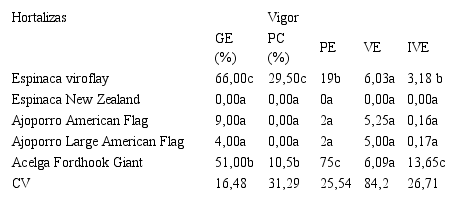 Los resultados obtenidos muestran que el porcentaje de germinación fue estadísticamente más alto (P<0,05) en la espinaca Viroflay con 66 % de germinación, seguido de la acelga Foordhood Giant con 51 %, mientras que los valores más bajos de germinación se observaron en los ajoporros American Flag y American Flag Large y en la espinaca New Zealand con valores de 9,4 y 0 %, respectivamente. Con relación a la velocidad de germinación, los híbridos que germinaron más rápido fueron la acelga Foordhood Giant y la espinaca Viroflay en 6,09 y 6,03 días, seguido de los ajoporros American Flag y American Flag Large, que germinaron a los 5,25 y 5 días, mientras que la espinaca New Zealand no germinó. El hibrido más eficiente durante la emergencia fue la acelga Foordhood con un IVE de 13,65, seguido de la espinaca Virofly, con IVE de 3,18. Por su parte, los valores más altos de IVE corresponden a ajoporros American Flag y American Flag Large, con 0,16 y 0,17.