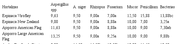 La mayor incidencia del hongo Aspergillus se observó en ajoporros American Flag y Large American Flag; la de los hongos Aspergillus niger y Fusarium spp., se presentó en el material acelga Foordhook Giant; mientras que la del Mucor sp. estuvo en la espinaca Viroflay; finalmente, la frecuencia más alta de bacterias se encontró en la acelga Foorhood Giant.