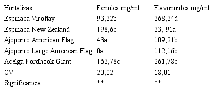 En lo que respecta a la concentración de flavonoides, los valores más altos se observaron en semillas de espinaca Viroflay con 368,34 mg/ML, seguido de acelga Fordhook Giant, con una concentración de 261,78 mg/ML; ajoporro Large American Flag, con 112,16 mg/ML y ajoporro American Flag, con 109,21 mg/ML, mientras que los valores más bajos se observaron en espinaca New Zealand, con concentración de 33,91 mg/ML.