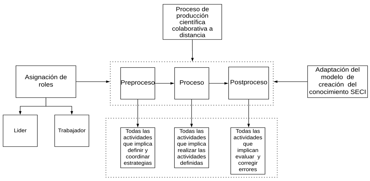 Teniendo en cuenta que la redacción de artículos científicos es un proceso de transmisión de las experiencias (conocimiento) de los investigadores, se buscó combinar el modelo SECI con el concepto de EVTC, para que de forma implícita el conocimiento pueda estructurarse uniformemente en la organización (en este caso, los realizadores del proceso de producción científica) y alcanzar así sus objetivos o productos finales. Es por esto por lo que este documento propone un modelo colaborativo para la escritura de artículos científicos a distancia con elementos del modelo SECI, para apoyar y definir las actividades de un proceso investigativo y, de esta forma, ayudar a los autores que por las circunstancias actuales de aislamiento no pueden reunirse en persona, lo que genera dificultades de coordinación, comunicación y realización de tareas conjuntas.