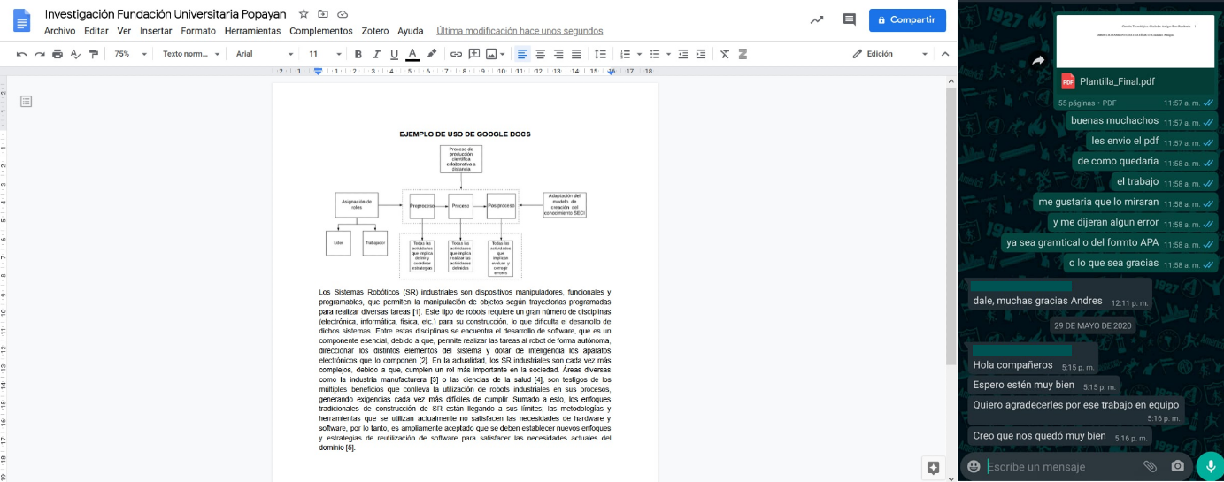 Actualmente, las Tecnologías de la Información y la Comunicación (TIC) son herramientas que pueden ser de gran ayuda para el desarrollo de las actividades colaborativas a distancia. A diferencia de épocas anteriores donde la madurez tecnológica de estas no era suficiente, hoy en día se tienen todas las condiciones para desarrollar un trabajo estructurado, organizado y eficaz para producir investigación científica dejando de lado las barreras geográficas. Sin embargo, lo anterior no solo se refiere a la escritura colaborativa, también el aprendizaje se ha beneficiado del desarrollo tecnológico. Es por esto por lo que es un momento crítico donde los investigadores deben invertir esfuerzos en desarrollar metodologías y herramientas que beneficien el trabajo colaborativo a distancia.