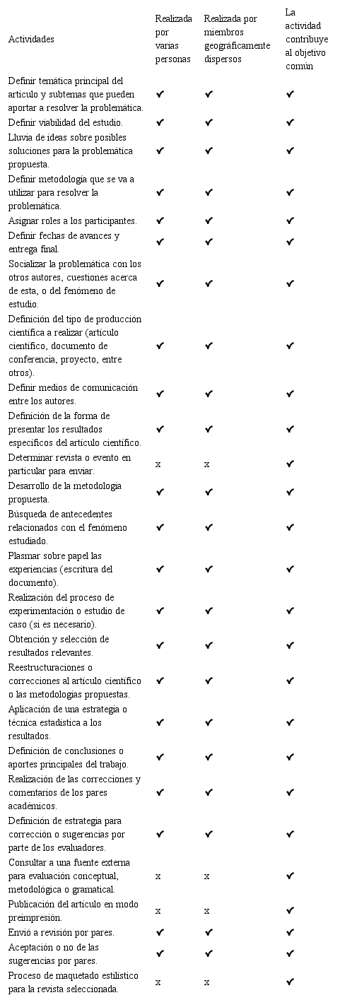 Para esto, las actividades deben cumplir tres criterios: ser realizada por varias personas, hacerse por personas geográficamente dispersas y que contribuya al objetivo común del grupo [39]. En la Tabla 1 se pueden observar las actividades filtradas según los criterios expuestos anteriormente.