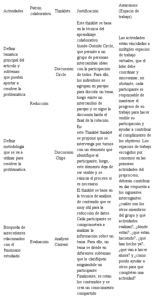 Ahora, una vez obtenidas las actividades genéricas que permiten contribuir a la escritura de documentos científicos, se procede a modelarlas de forma colaborativa. Para esto se estructuraron considerando los tres principios básicos de la colaboración: igual participación, responsabilidad individual e interdependencia positiva [40]. Sumado a esto, las actividades colaborativas fueron modeladas usando thinklets. A continuación, se puede observar un ejemplo de este tipo de modelamiento que, para efectos del presente documento, solo se exponen algunas.