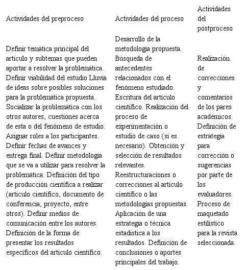 La escritura de artículos de investigación es un proceso que se compone de una serie de actividades que se realizan acorde a su ejecución temporal. En el modelo propuesto estas actividades se han encapsulado en fases (preproceso, proceso y postproceso), tomando como referente a Collazos en [38], donde propone dividir la escritura de cuentos colaborativos; pero, en el caso de esta investigación, se adaptó a la escritura de artículos de investigación.