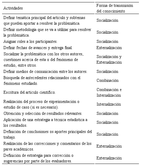Las actividades que se seleccionaron mediante la encuesta tienen dos características principales: en primer lugar, se pueden modelar colaborativamente, y en segundo, se utiliza alguna forma de transmisión del conocimiento al realizarlas (socialización, externalización, combinación o internalización) [9]; por esto es importante mencionar que la metodología propuesta tiene implícitamente las formas de transmisión propuestas en el modelo SECI; de esta forma el conocimiento se transfiere de manera uniforme entre los autores del documento científico.