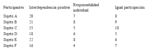 Interdependencia positiva: la medición de este apartado se realiza mediante el conteo de frases tales como: “yo puedo trabajar en este apartado” o “me comprometo a realizar esto”; es decir, todas aquellas expresiones que tengan como fin aportar al objetivo común.