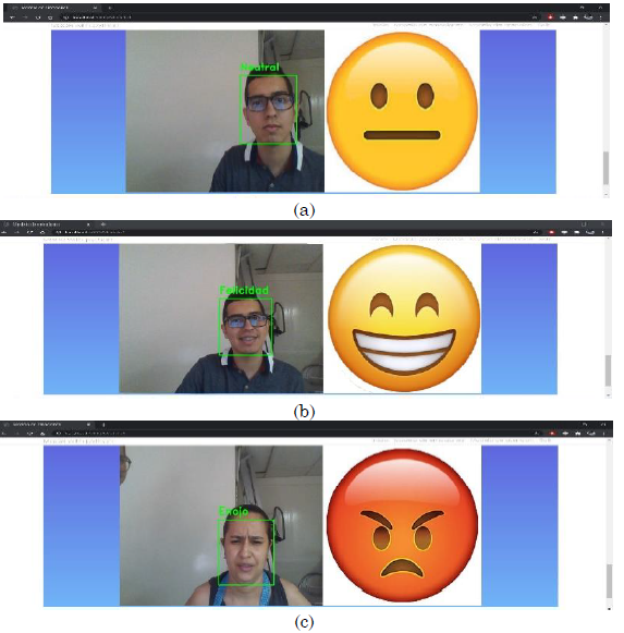Al momento de acceder a esta pestaña desde la página principal anteriormente vista, se observó la rápida carga de la información visual (imágenes) y de texto. Sin embargo, en el apartado de la pestaña donde se muestra en tiempo real la captura de la cámara y su clasificación de emociones, se nota un pequeño retraso de 1 a 3 segundos para que se encienda la cámara y empiece a procesar los primeros frames. Se evidencia el buen funcionamiento del modelo, siendo este capaz de reconocer las expresiones faciales neutral, feliz y enojado para las que fue inicialmente programado; sin embargo, al ser un modelo con implementación simple, suele tener algunos problemas en entornos de iluminación deficiente. El enrutamiento desde la página principal hacia la página del modelo de emociones se realizó de manera satisfactoria sin ningún fallo o código de HTTP que pudiera indicar algún problema. En la Figura 9a se presenta la emoción neutral, en la Figura 9b la emoción de felicidad y finalmente en la Figura 9c la emoción de enojo.