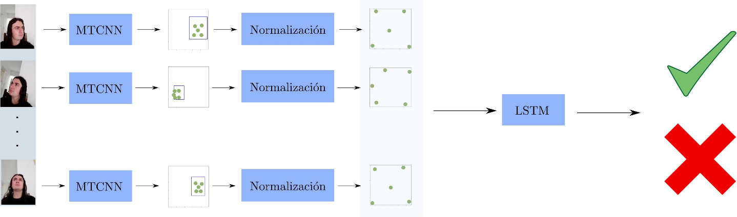 Modelo 2: el segundo modelo toma como entradas secuencias de video de un segundo tomadas a 30 fps. Cada uno de los cuadros de esta secuencia se pasa por el modelo red neuronal convolucional multitarea (MTCNN, por sus siglas en inglés) [27], [28] del que se obtienen 5 puntos fiduciales del rostro de la persona: el centro de los ojos, la nariz y las comisuras de la boca. Adicionalmente, se obtienen los puntos superior izquierdo e inferior derecho del cuadro que enmarca el rostro (bounding box). Después, los puntos fiduciales se normalizan con respecto al bounding box, generando una secuencia para cada uno de los puntos fiduciales. Esta secuencia multivariada se utiliza para entrenar una red recurrente con arquitectura Long Short Term Memory (LSTM) con dimensión oculta h = 100, que clasifica entre las secuencias donde los sujetos prestan atención y las secuencias en las que no se presta atención. El procedimiento se puede ver en la Figura 2.