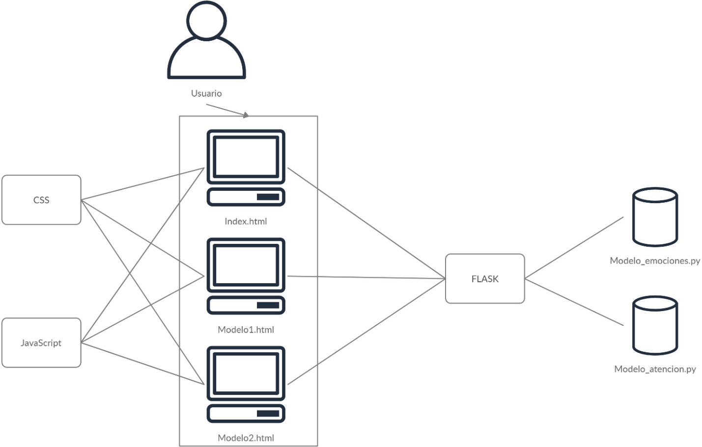 En este trabajo se presenta el desarrollo de una aplicación web que integra dos modelos de reconocimiento de rostros; el primero de ellos para la detección de emociones expresadas ante la cámara; el otro, para la detección de atención a la pantalla del computador aplicables a entornos virtuales de aprendizaje. Para la composición de los modelos se utilizó el framework Flask y se puede concluir que su uso permite la integración de algoritmos de inteligencia artificial ofreciendo gran rendimiento. Además, Flask permite diseñar una interfaz agradable con características de usabilidad que integra los algoritmos y así el usuario final no tiene que estar en contacto ni tener conocimientos de Python, sino que consume la aplicación final. Por otro lado, se evidenciaron las ventajas de Flask al manejar el MVC, lo que permite un desarrollo más ágil y la reutilización de código. En este trabajo se separaron las capas así: en el Modelo se desarrollaron los algoritmos de detección de rostros, el controlador se encargó de la comunicación entre el modelo y la vista y en la capa de vista se desarrolló la interfaz o el frontend de la aplicación. Cuando se realizaban cambios en el modelo, por ejemplo, la actualización de los algoritmos de reconocimiento de rostros, la vista no se modificaba, lo que permitió que varios desarrolladores trabajaran en el mismo proyecto diferente capa, sin afectar el trabajo del otro.