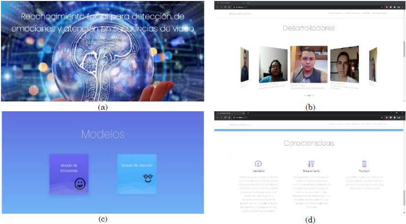 La aplicación se desarrolló en Flask con la arquitectura MVC. Al ingresar a la aplicación el usuario entra a la vista index.html, donde se encuentra una pantalla de inicio (Figura 7a), un apartado mostrando los desarrolladores del aplicativo que se realizó en Javascript con la librería Swiper (Figura 7b), permitiendo mejorar el diseño y aplicar dinamismo a las imágenes, un apartado con 2 botones (Figura 7c) para que el usuario vaya al modelo que desee y, finalmente, un apartado de características descritas con texto y algunos iconos (Figura 7d).