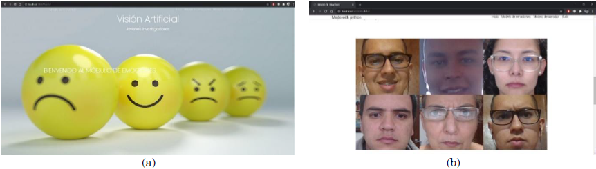 Para la pestaña del modelo de emociones, Modelo1.html, se observa un apartado de bienvenida (Figura 8a), un apartado de galería con algunas imágenes de ejemplo utilizadas para el entrenamiento del modelo (Figura 8b) y finalmente un apartado con un recuadro que muestra la captura que hace la cámara en tiempo real y la identificación de emociones.