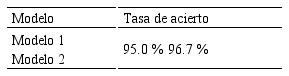 Los modelos se entrenaron dividiendo los datos en 80 % para entrenamiento y 20 % para prueba. De los datos de entrenamiento, se deja un 20 % adicional para validación con el fin de sintonizar los parámetros de los modelos. En el modelo 2, se utilizó Adam como algoritmo de optimización con una tasa de aprendizaje de 0.01. El tamaño del batch se ajustó en 16, se utilizó entropía cruzada como función de costo, y se entrenó durante 100 épocas. Los porcentajes de tasa de acierto de clasificación para cada uno de los modelos se muestran en la Tabla 1.