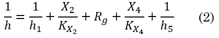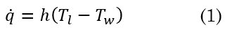 Donde, q ̇ es el flujo de calor, h es el coeficiente global de transferencia de calor entre el acero líquido y el refrigerante, Tlla temperatura del acero líquido y Tw la temperatura del agua de enfriamiento. Pero h puede definirse por una serie de resistencias térmicas encontradas al flujo de calor, como se observa en (2) [12],[38],[42],[44]:
