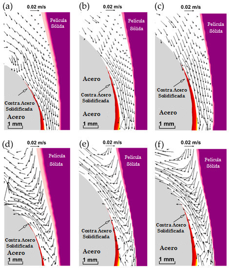 Los resultados se muestran en la Figura 10, y en ella se observa que los vectores de la escoria líquida se infiltran entre el molde y la costra de acero solidificada formando un canal.