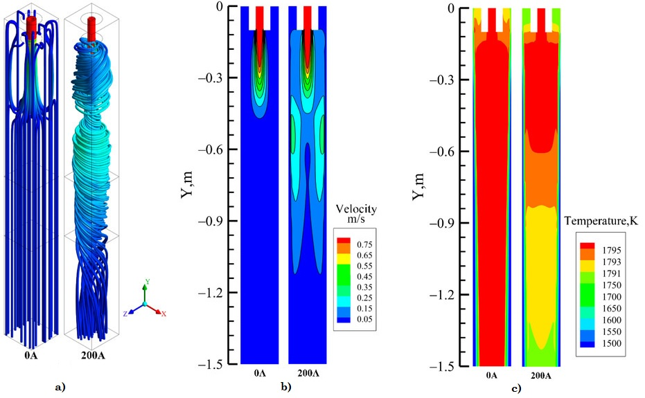 En [98] observaron que, sin aplicar agitación electromagnética en el molde, el acero fundido presenta velocidad radial en la sección transversal horizontal, desde el centro hacia el exterior, y con la aplicación de agitadores electromagnética, el fundido fluye en remolino en la transversal horizontal. Encontraron que el acero líquido se expande cuando aumenta la intensidad de corriente, debido a que aumenta la fuerza electromagnética tangencial y radial sobre el acero. En [98] también determinaron que al aumentar la intensidad de la corriente de 0 A hasta 300 A, la relación central de cristal equiaxial del lingote aumento un 10 %, este efecto es bueno para el refinamiento de la estructura solidificada y para la segregación central. En [85] desarrollaron un modelo matemático multifísico en 3D con agitación magnética: los resultados mostraron que con la aplicación de 200 A se forman dos remolinos horizontales, que hacen que la zona de recirculación superior se alargue en la dirección de colada y se promueva una segunda zona de recirculación a la salida del molde, mostrado en la Figura 11a. En Figura 11b observaron que a la intensidad de corriente de 200 A la penetración del flujo en el molde se hace menor tomando como referencia la salida de la BES, que la velocidad del fundido en la posición de instalación del sistema electromagnético se hizo mayor por el efecto magnético y la velocidad del flujo en el frente de solidificación aumento, lo que significa que los efectos de lavado del acero fundido en la capa solidificada se vuelven más significativos. En la Figura 11c, mostraron cómo la zona de alta temperatura del acero se desplaza hacia la parte superior del molde debido al efecto de agitación electromagnética que inhibe el impacto de la corriente de inyección con la alta temperatura de la BES. Hubo un aumento en el gradiente de temperatura en el frente de solidificación, lo cual es beneficioso para la extracción de calor a través del molde refrigerado. Y en la zona alta del molde, al igual que a la salida, la temperatura tuvo una disminución, por lo que se presume que el molde refrigerado extrajo más calor del fundido.