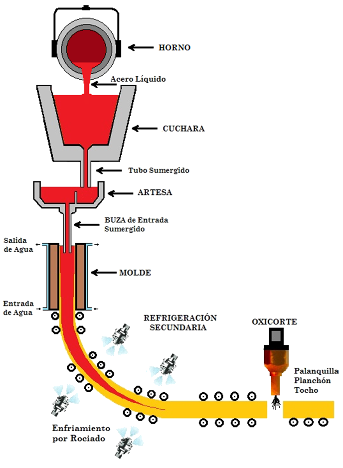 El primer paso para lograr la transformación masiva del arrabio en acero, lo dio el ingeniero inglés Henry Bessemer en 1855, cuando patentó un proceso que marcó el paso decisivo en la elaboración del acero a partir del hierro producido en el alto horno en cantidades industriales y a bajo costo [1]-[3]. Más tarde en Europa, en la década de 1950, en un intento por incrementar la productividad de acero, se desarrolló el proceso de la colada continua (PCC) [4]. Se denominó continua porque permitió la solidificación del metal líquido y el retiro inmediato de un molde [5], [6]. La ventaja más importante de este proceso es la regularidad [7], y ha permitido conseguir los mayores avances en la producción de acero [8], [9], aumentando significativamente su consumo en las últimas décadas en todo el mundo [10].