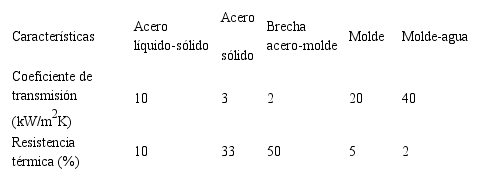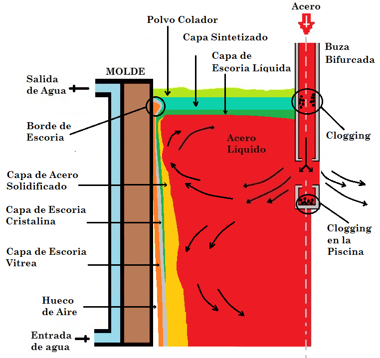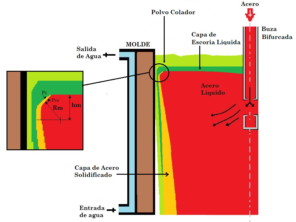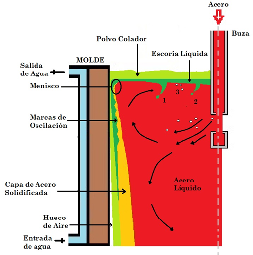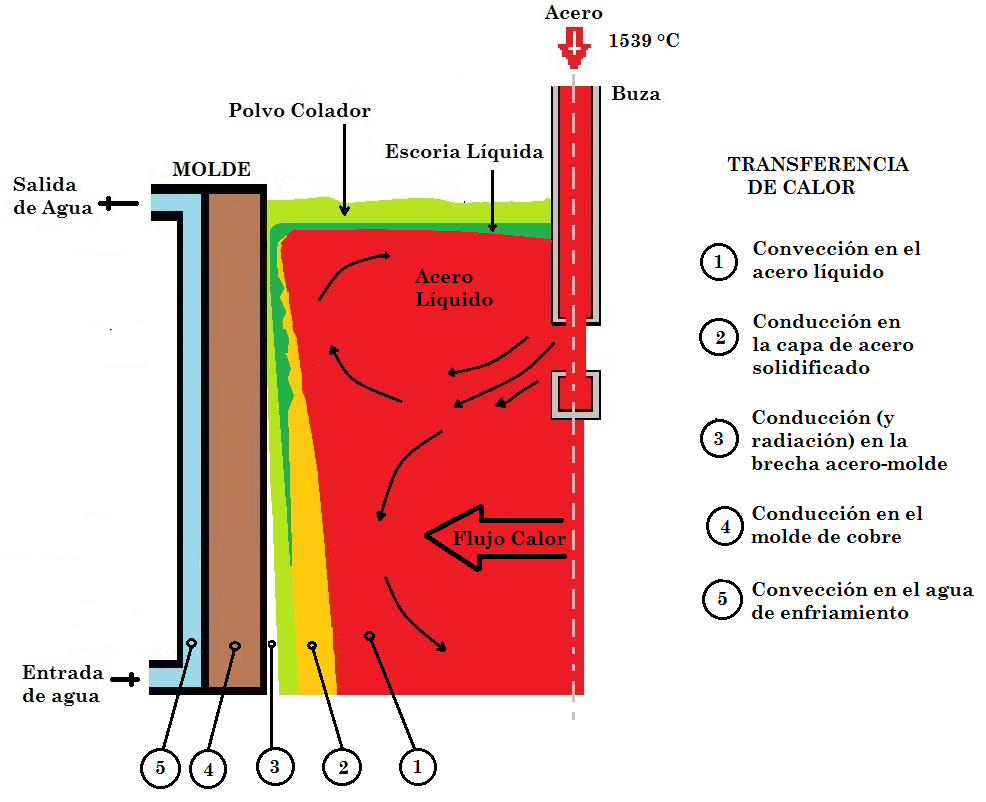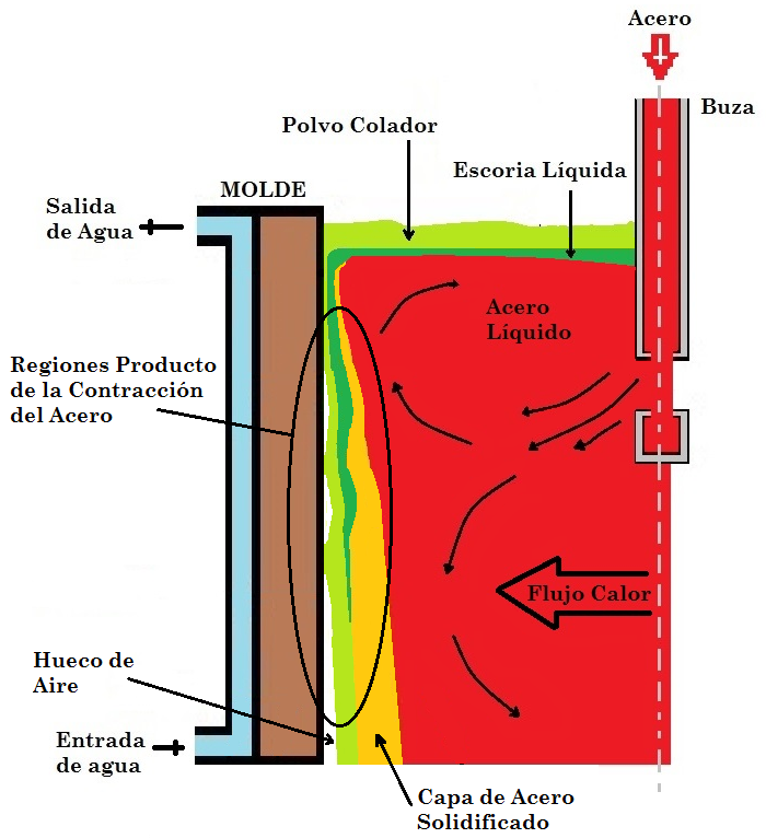 Durante la formación de la capa solidificada de acero, el máximo flujo de calor que se extrae en el molde corresponde al sitio donde inicia la solidificación, es decir, en el menisco, y la principal resistencia encontrada al flujo de calor se debe a la interfaz acero solidificado-molde por la formación de un hueco de aire que tiene su origen en la contracción del acero y la deformación del molde. En esta brecha, el polvo colador se infiltra formando diferentes capas (vítreo, cristalino o líquido), producto del contacto con el molde refrigerado y el acero líquido. Las capas juegan un papel importante en la transferencia de calor, y el aporte de cada una de ellas dependerá de su espesor y conductividad, que, a su vez, dependen del perfil de velocidad, temperatura de cristalización, viscosidad y estado. El flujo de agua que enfría al molde no es menos importante, también tiene su responsabilidad en el proceso porque si las "caras frías" se calientan demasiado, puede producirse ebullición, lo que ocasionará variabilidad en la extracción de calor y defectos acompañantes.