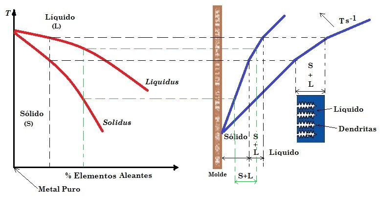 La velocidad de enfriamiento es otro parámetro importante y está relacionada con la rapidez con que se le extrae calor al acero líquido en el molde [18]. Durante el enfriamiento, el avance del frente de solidificación se hace vulnerable, y esto se debe a que hay una estrecha relación entre la velocidad con que se realiza el enfriamiento como el intervalo de solidificación de la aleación, este fenómeno se muestra en la Figura 4.