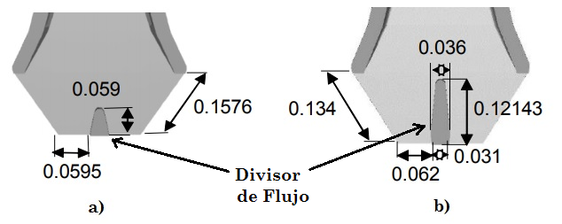 En [30] variaron la longitud de inmersión de una BES en un molde, así como el diseño interno (ver la Figura 7) para estudiar las fluctuaciones de presión y velocidad. Encontraron que con una menor altura del divisor (Figura 7a), se forman vórtices en la BES por la forma de separación de la capa limite en el divisor de los puertos, fenómeno que aunado a la recirculación del acero proveniente del fondo del molde provoca la falta de simetría en los chorros y oscilaciones a altas velocidades de colada, mientras que al aumentar la altura del divisor (Figura 7b), se tiende a eliminar la formación de vórtices.