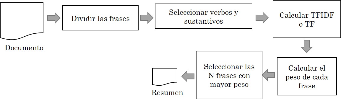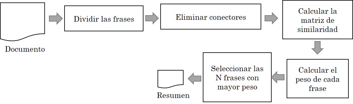 Dentro de las diferentes técnicas de resumen automático de textos, usualmente se emplean enfoques extractivos, los cuales seleccionan las frases que representan las ideas principales, eliminando, inicialmente, los conectores y, posteriormente, determinando la importancia o peso de la frase. Entre estos métodos se encuentran los basados en métricas de similitud [15], [16]. Entre las distancias empleadas para calcular la similitud de las oraciones se encuentra la distancia coseno [17]. Esta matriz es empleada por el algoritmo PageRank [15], [16] para calcular los pesos de las frases. Finalmente, se seleccionan las N frases con el peso más alto para construir el resumen. El método se describe en la Figura 1.